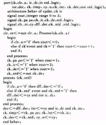 (1)加法器模块(add14) 直接引用MAXPLUSⅡ的参数化设计库PLM内容。 (2)时钟校正模块(updat_ck) 代码中clr_a和ic_dc为全局清零信号和被校时钟快慢标志,id_dc为1表示Tx比Ts慢,则插入脉冲inc端有输出;反之,扣除脉冲dec端有输出。inc,dec即为图2的inc_o,dec_o。主要代码如下(省去了加法器的元件例化及IEEE库说明等):